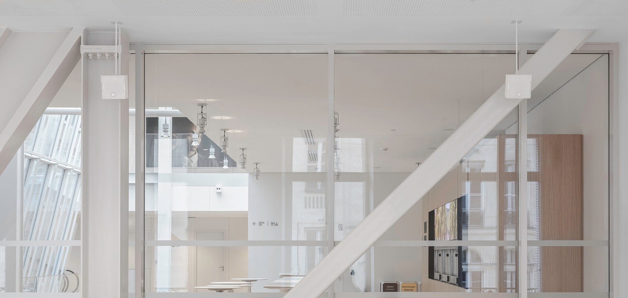 Dans un espace B2B à haute exigence architecturale, notre équipe d’intégration a conçu et déployé une solution sur-mesure alliant performance technique, cohérence esthétique et exigence acoustique.